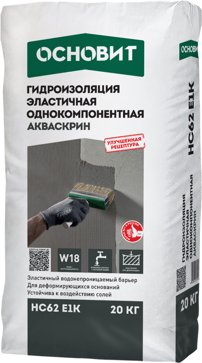 ОСНОВИТ АКВАСКРИН НС65 изготовлена на основе цемента и модифицирующих добавок. Гидроизоляционный материал экологически безопасен, не содержит вредных примесей, оказывающих отрицательное воздействие на здоровье человека. Соответствует действующим на территории Российской Федерации гигиеническим нормам.