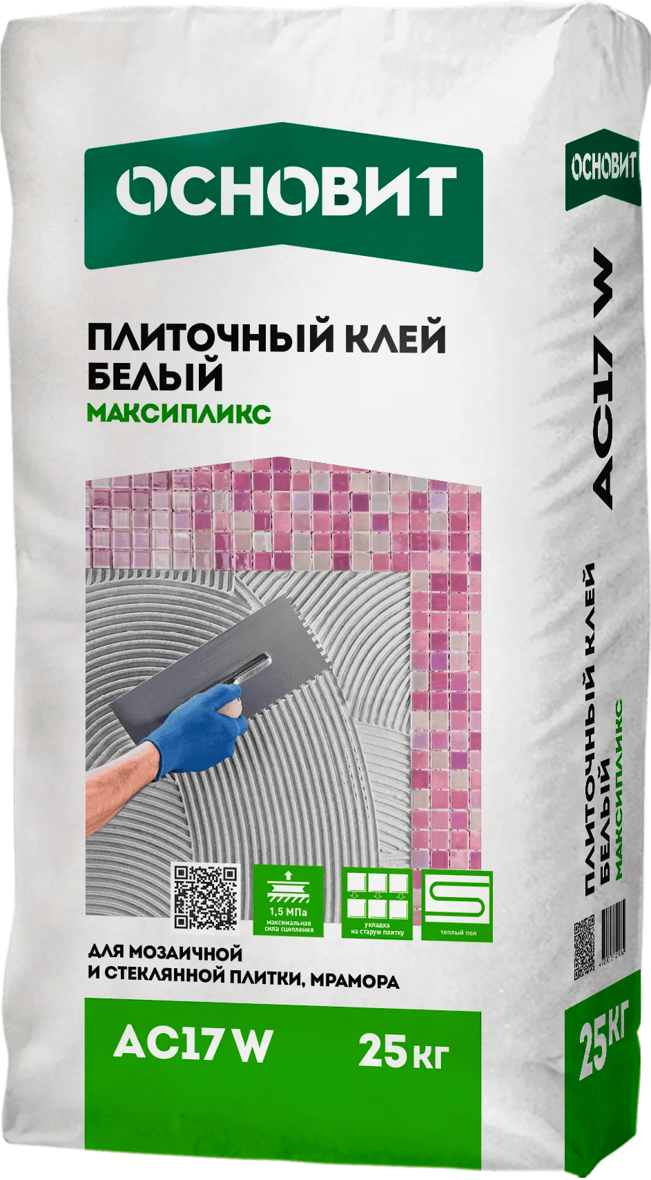 Плиточный клей ОСНОВИТ МАКСИПЛИКС АС17 W предназначен для облицовки стен и пола плитами из мрамора, цветной и прозрачной стеклянной плиткой, декоративной мозаикой, стекло-блоками, гранитом, натуральным и искусственным камнем. Используется для облицовки искусственных водоемов, чаш бассейнов, каминов. Рекомендуется для облицовки балконов, террас, цоколей, фасадов, полов с подогревом. Для внутренних и наружных работ..